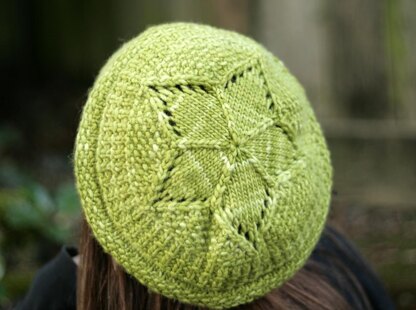 Baby, you’re a star! This deceptively simple hat cycles rapidly through different textures, only to be topped off with a plump fivepointed star that incorporates the decreases! As written it makes a little tam, but you could add extra length before the decreases for a more typical slouchy hat - perhaps by adding extra rows into the ribbed or seed stitch sections. To enhance the beret shape, block flat as shown in the second photo.