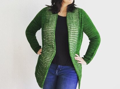 Il est tricoté d’une pièce, en top down, sans coutures. Les mailles sont relevées tout autour des devants et de l’encolure pour tricoter ensuite la large bande de brioche.