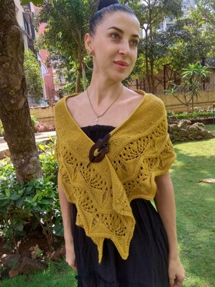 Honey and Lavender is a DK weight, shallow crescent-shaped shawlette that can be worn over an evening gown or as a perfect complement to your little black dress. The shawlette can also be worn as an accessory over a shirt, tee or top. The shawlette uses a flame or open flower-like lace pattern that represents a fiery spirit, a daring yet charming soul.