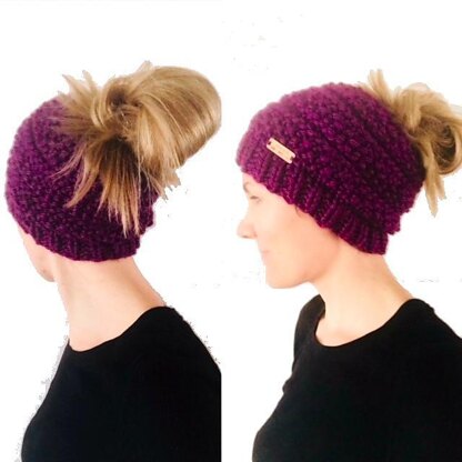 As a messy bun hat/ponytail beanie, this hat may be finished as a closed top as well. It is adorable topped with a pompom or left as is. While the original pattern is written for an adult size, child/toddler adjustments are included in the notes. This pattern includes materials, gauge, abbreviation key, stitch explanation, tips and alternatives. A 50% off promo to my Etsy shop is also included on the last page.