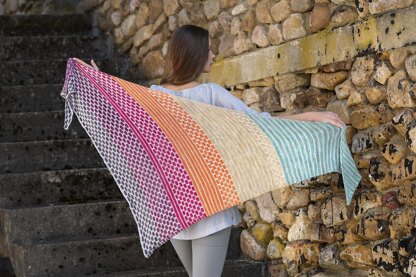This fun-to-knit, two-color shawl is worked from one point, increasing outward. The body of the shawl is worked in a combination of garter stitch stripes and a honeycomb pattern.