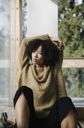 The Honeydew sweater is worked seamlessly from the bottom up. The entire body is worked in the textured pattern based on simple twists. Front and back are divided at armholes, shaped separately and then joined at the shoulders using a centered double decrease. Stitches are picked up around the neck which is then finished with a ribbed cowl neck using increasingly larger needles. Finally, the stockinette sleeves with ribbed cuffs are worked in the round.