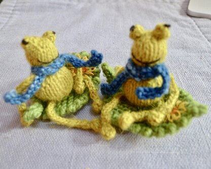 This cheerful little frog is knitted in 4 ply on double pointed needles. He sits on his own little leaf which has a brooch back so you can pin him on your hat or coat. The pieces are quite small for this project so some patience is required when putting him together but the end result is very worthwhile. One 50 gram ball of 4 ply will make lots and lots of frogs which is great because everyone will want one.