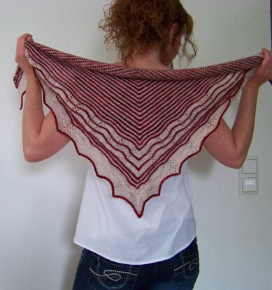 Fertige Maße: 130 cm, gemessen von Seite zu Seite und 60 cm tief, gemessen am tiefsten Punkt, in der Mitte des Tuchs, nach dem Spannen. Material:Garn: Madelinetosh Merino Light (100% Merino 100 g / 384 m), Farbe A (Farmhouse white): 65 g / 250 m, Farbe B (Tart): 50 g / 192m. Nadeln: Rundstricknadel Nr. 3,5 mm. Sonstiges: 4 Maschenmarkierer, Wollnähnadel und eventuell einen Reihenzähler. Maschenprobe: 19 Maschen und 38 Reihen = 10 x 10 cm, in glatt rechts, nach dem Spannen, mit Nadelstärke Nr. 3,5 mm. Die Maschenprobe ist nicht wichtig bei diesem Projekt. Eine andere Maschenprobe kann allerdings ein größeres oder ein kleineres Tuch ergeben und der Garnverbrauch ändert sich.