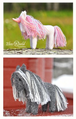 Horse and Unicorn toys are knitted flat. The finished toy is approximately 5 inches (12.5 cm) tall. The size is perfect for a child's hands.