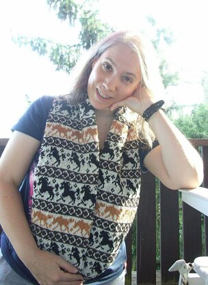 I've been always fascinated by the elgegance of horses... As the horse beanie became very popular I longed for a matching scarf to go with it. And as loop scarves or infinity scarves can be seen everywhere I thought I give it a try. There are three different horses on it, the bands divided by a little easy-to-knit horseshoe chart. I knit the horses in two colors (light brown and black), but you can certainly knit them in your favorite colors or your favorite horse colors. You can only use two colors (e.g. black and off-white through the whole scarf). The horses are bigger this time ;-) So there was more room for detail.