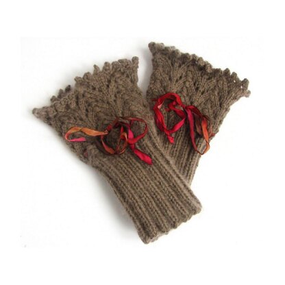 These cuffs came into existence as I played with stitch patterns to showcase single skeins of luxurious yarns such as cashmere and angora blends. The horseshoe lace is a simple pattern repeat with a romantic feel, especially when embellished with delicate seed beads around the picot edging and a ribbon threaded through the lower eyelets. Use the most luxurious yarn you can find and you'll feel special each time you wear them!