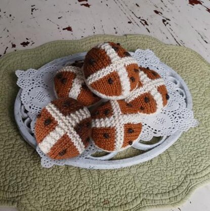 Children will have hours of fun playing with these hot cross buns. Knitted in DK yarn on smaller needles to keep the weave tighter so that no stuffing can seen nor pulled out by small fingers. Also great to make for gift and fair products to sell. Knitted flat with 3.5mm (US #5) knitting needles to give a tight weave