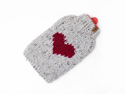 Pattern includes several photos showing the steps, final measurements, specific yarn recommendations and information on the rubber bottles needed. The cover is knit in the round. The heart is stitched on afterwards using Duplicate Stitch.
