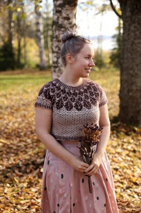This sweater is worked top-down seamlessly. The sweater has a round yoke with a lovely feather pattern and the body of the sweater has a simple color work texture. The sweater has short sleeves and the hem is cropped. Please note that CC is held double throughout the pattern.