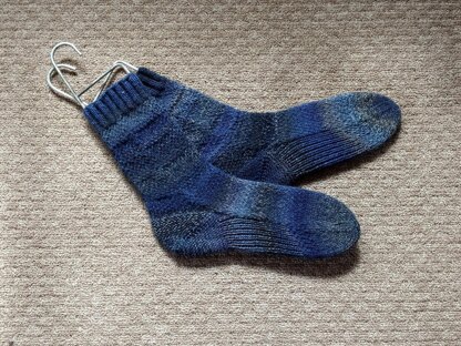 The construction of the hugs and snugs sock is cuff down, however; you could certainly make them toe up by stitching the socks backwards. The stitch pattern rows are different for the foot than for the leg, but it would be very easy to convert this to a toe up sock.