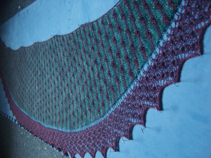This two-tone, sideways knit, crescent shawl is sweet enough to eat. It features a picot stripe on a stocking stitch background. A lace edging is applied separately to the lower edge, so is optional. The top edge is picked up and finished with a picot bind off. This pattern is charted and is rated as moderate (without edging) or advanced (with edging).