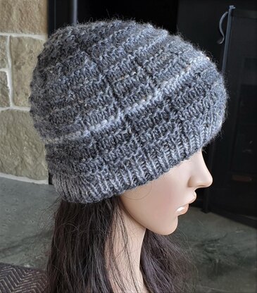 This family Beanie has a 1x1 rib brim then is worked in an easy textured stitch.