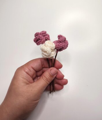 Our little flowers have many possible applications. You can use small twigs and create a bouquet, you can sew them on your knitting or crochet pieces or even sewn pieces.
