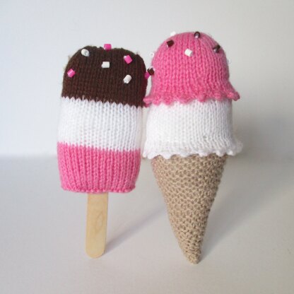 Knit some sweet Ice Cream Treats - an ice cream cone with 2 scoops, and an iced lolly (or popsicle). Designed by Amanda Berry @fluffandfuzz, these toys are knitted in acrylic DK yarns on single pointed needles (not in the round). The ice cream uses a frilled cast on technique and a three needle join, and the lolly uses knitted stripes and Kitchener stitch grafting. For confident beginners and above, other techniques used include casting on and off, knits, purls, increases and decreases, and seaming to finish. The ice cream is 8.5cm wide x 21cm tall, and the lolly 12cm tall x 8cm wide (not including the stick).