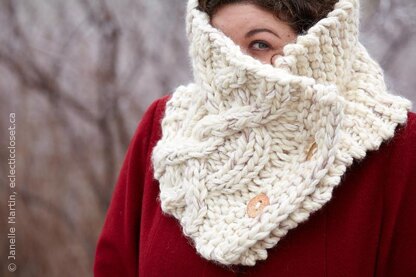 About this Project: This project is a perfect stash buster. Multiple strands of yarn are held together to create a one-of-a-kind yarn. The centre cabled panel is worked first. Stitches are then picked up along each side of the panel to form the body of the cowl (long side) and the button-hole tab (short side).