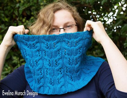 Made in worsted weight wool, Icicle Cowl uses a simple cable pattern with eyelets. It is worked top down, with increases widening it at the shoulders for comfortable fit.
