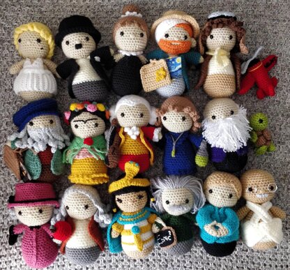 Included patterns: Audrey Hepburn Mozart Marilyn Monroe Charlie Chaplin Vincent van Gogh Amelia Earhart Leonardo da Vinci Frida Kahlo Angela Merkel Charles Darwin Marie Curie Gandhi Isaac Newton Cleopatra Einstein Queen Elizabeth II The dolls will be about 18 cm long (using Aran weight yarn). The patterns are written in English (US) using US terminology