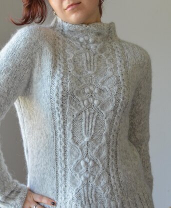 The Iduna Sweater is knit seamlessly from the top down, featuring a contiguous sleeve construction and a comfortable turtleneck. The front dazzles with an intricate pattern of cables and bobbles, while the rest is worked in simple stockinette. Designed with a slight A-line shape for added ease at the hips, the split hem adds a casual, stylish touch.