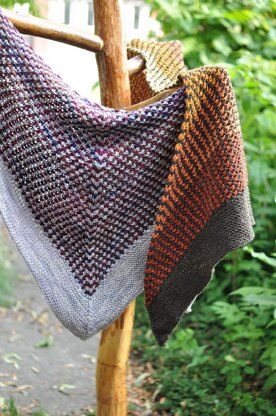 Ilkley is a triangular shawl, knit from the bottom up - you start with lots of stitches but start decreasing right away! No casting off hundreds of stitches. Shown in two sizes, a two-colour smaller scarf and a five-colour ombre version in a larger shawl size. The non-lacy stitch pattern is cushy yet airy, and easy to work! Perfect for small amounts of sock yarns or handspuns.