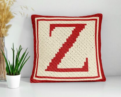 Initial Name Letter Z Pillow crochet pattern created with the mini Corner-to-Corner (C2C) crochet technique. Bold serif-style red “Z” framed on a cream background with a double border, making it a striking monogram design. Perfect as a personalized accent cushion or nursery décor piece.