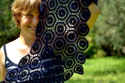 Ink Ripples is a charming wrap made of hexagonal motifs, which, with the specific joining method, imitate needlepoint lace and create a spectacular circle pattern.