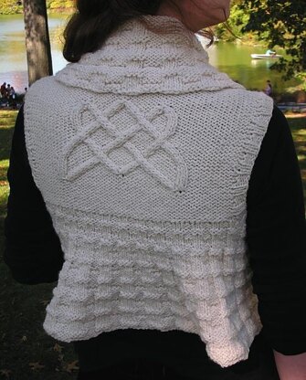 A unique Celtic knot graces the back of the garment while dramatic lapels fold on the front.