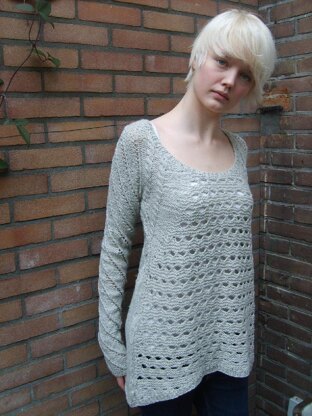 This amazing fashionable sweater is knit in a combination of different lace and cable patterns and is perfect for transitioning into spring. The top-down construction is quickly knitted up, although you may have to pay some attention at first to the different stitches… The sweater has narrow sleeves but the body skims rather than clings for ease of movement. The deep neckline and lace pattern make sure the sweater doesn't get too hot. Inspired by great fashion icons, you can look fabulous in this. The hem is rounded, so the front is shorter than the back. Be sure to pick yarn with some drape to ensure your sweater is as comfortable and stylish as this one!