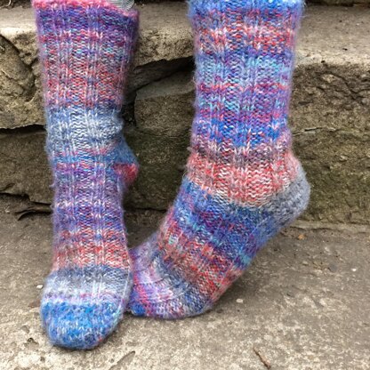 The perfect socks for very cold feet, the perfect socks for anyone with too much sock yarn, and even the perfect socks for impatient knitters! Knit with 2 strands of sock yarn at once. Great winter boot socks, and ideal for padding around the house on frosty mornings. Ribbed Toe-up socks with Short-row toes and extra-deep short-row heels. In 3 adult sizes, also includes thorough customization ideas/resizing guidelines. All the math has been done for you, just sit back and knit some (super fast!) socks. They go so quickly at a gauge of 5.5sts/in (22sts/4in, 22sts/10cm).