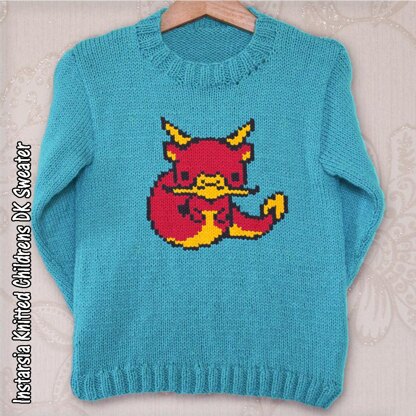 A picture of a Dragon, Wyvern, Drake or Wyrm, a cute mythical animal sweater inspired by the Chinese zodiac. Pattern includes chart for the image and written instructions for the sweater. I recommend using intarsia technique for the block colours and duplicate stitching the details.