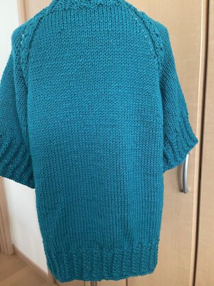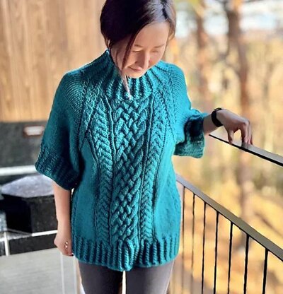 Interwoven is a half-sleeve sweater featuring intricate cable patterns that create a textured and engaging fabric. This design is worked top-down in the round, resulting in a seamless construction. The combination of flowing cables and a structured fit makes it a versatile piece suitable for various styles and occasions.