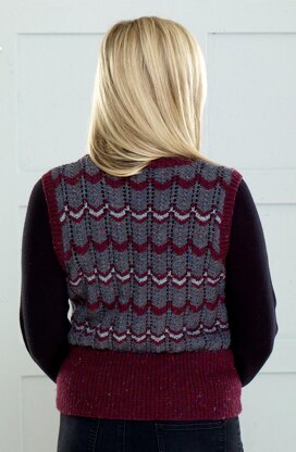 IRIS is simple slipover that will look just as good with smart clothes as with jeans! Easy 1x1 ribs hug around the waist and trim the neck and armholes, whilst the main sections are knitted in stripes in a classic chevron stitch pattern. Versatile and easy to wear, IRIS will quickly become a wardrobe favourite!
