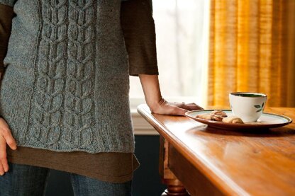 A long line of cool cables brings the eye to the center of the waist, while short sleeves and ribbing at the top balance out the long length. The elements of the sweater are simple enough to keep the focus on the beautiful yarn, and create a tunic versatile enough to wear with almost anything.