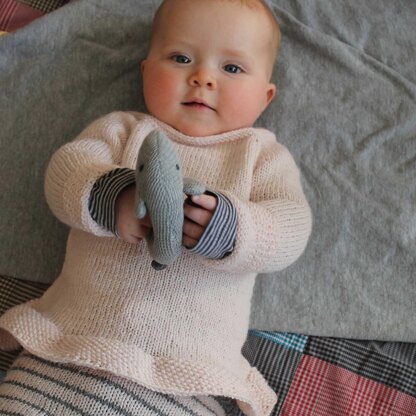 A modern sweater with ruffled skirtpart and pearl stitch details. Body and Sleeves are worked in stockinette stitch, the ruffled skirt part as well as the cuffs are worked in pearl stitch. It’s worked seamlessly topdown, increases are worked besides the raglan seams.