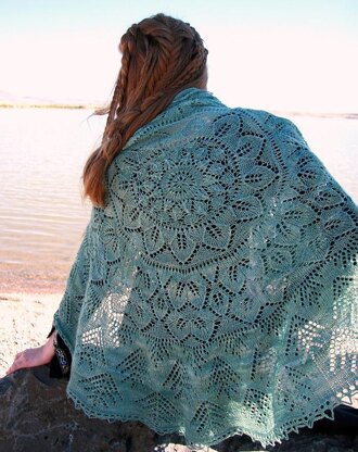 This circular shawl is knit from the center point outward, and shaped with the use of yarn-over increases. The shawl features several leaf and tree lace motifs, and is finished off with a crocheted lacey eyelet border. All the lace motifs are presented in chart form only.