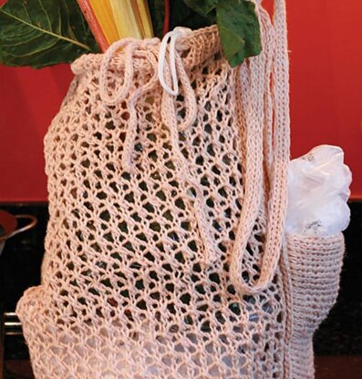Enjoy filling your bag at the market or grocery store and watch as it stretches to fit your purchases. Knit in the round with two strands held together, the seed stitch bottom is bordered by garter ridges. The body continues in an open pattern. A practical side pocket provides storage for your own plastic bags with access from top and bottom. Add a wide shoulder strap, then finish it off with an I-cord drawstring.