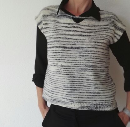 Construction: This boxy top is started by knitting the back top down to the base of the armhole. To fit the shoulders short rows are used. Then both fronts are knitted separately from the top down to the neckline. After joining both fronts and working cut out front is worked down to the base of the armhole. Here back and front are joined to work in rounds straight up to desired length.