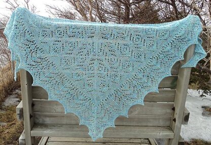 This is a heart-shaped shawl knit from the top down. The stitches are fairly simple and it's a good knit for a beginner to lace, however there are many beads (~ 1500).