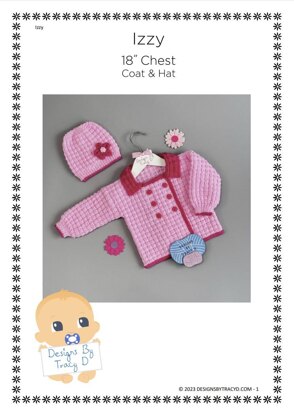 Izzy is a Baby Knitting Pattern for a Double Breasted Coat & Hat suitable for a boy or girl. It is to fit a baby 18" chest (It is a generous size 18" ) and is made using DK yarn with 3.25mm and 4mm needles. You will need 200g of yarn to make the Coat & Hat. This is a straightforward pattern to make. If you want it in a bigger size it can be made using Aran yarn with 4mm & 5mm needles, following the pattern exactly.