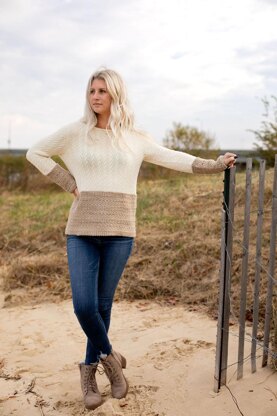This alpine-inspired pullover uses two-tone coloring and different textures in a standard-fitting sweater. It is worked seamlessly from the bottom up with set-in style sleeves worked by picking up stitches around the armhole, then using short rows to shape the sleeve caps.