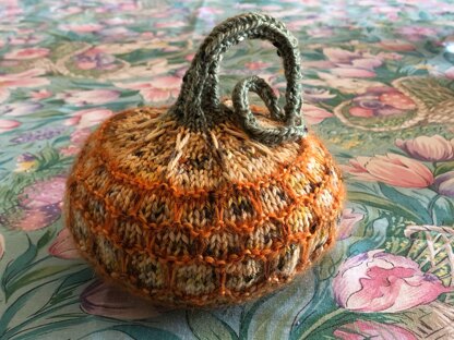 Jack-Be-Little is a variety of tiny pumpkin readily available each Fall. ThisJack-Be-Little knits up quickly and is made with slipped stitches. The pattern also includes Jill-Be-Little (another variety) and Ghost-Be-Little (slight poetic license taken here). The options vary only in the height of the central slipped stitch section of the pumpkins. In Jill-Be-Little, all sections are the same height. In Jack-Be-Little, the middle section is two stitches taller, and in Ghost-Be-Little, four stitches taller than the other sections.