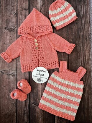 TThis knitting pattern provides the instructions to make both the romper, Dress, Hooded coat, Beanie hat and booties.