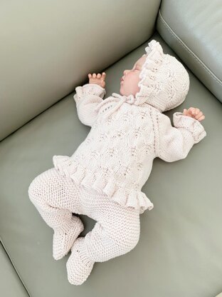 This pattern provides the instructions to make the tights, top, and bonnet. The top and bonnet are both knitted from the top down on straight needles. The tights are knitted one leg at a time and joined together at the crutch. With the option to sew small pearl beads to the base of each flower pattern on the top and bonnet.