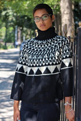 Bold, graphic patterns are back in fashion, and what better way to show that follow the trends than with this stunning graphic turtleneck. The three-quarter sleeves and lower body are knit separately, and then joined at the underarm to create the dramatic yoke. The knitted fabric, produced by Berroco Ultra Alpaca Light, in shades of black and winter white, provides not only warmth and comfort, but a soft drape that allows the garment to move with you. This design originally appeared in Knit N Style magazine.
