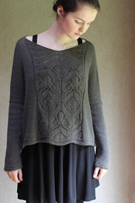 Construction: Sweater is knitted flat from the top down in one piece. Beginning with a provisional cast-on at the neckline, front and back are worked separately. Sleeves are picked up and knitted flat .