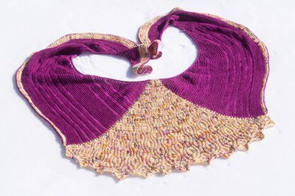 Yarn: Color A: The Violet Valentine “Favorite Sock” JAM berry (75% superwash merino/15% cashmere/10% silk) 430 yds (393m)/115g and Color B: The Violet Valentine “Dylan DK” Good Morning Beautiful (100% superwash merino) 250yds (229m)/115g Note: pattern can be worked in all fingering weight or all dk weight yarn. For fingering weight shawl: use 2 complimentary hanks of at least 400yds (366m) For dk weight shawl: use 400yds (366m) for color A and 250yds (229m) for color B.