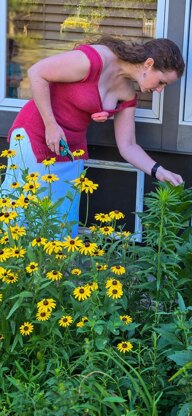 This romantic off-the-shoulder top is perfect for a warm encounter in the garden! Knit from the top down in one piece, it features waist shaping and a split seam at the hips for a more flattering, tunic-length fit. It also showcases a dramatic flower applique for a bit of extra drama in an otherwise simple garment!