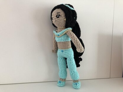 With yarn length 150m/50g this doll is about 30 cm high.