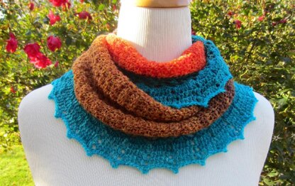 Jess's Cowl is a long, lacy cowl worked in one of the dreamy Freia Ombre laceweights. It takes one ball to complete the cowl. The body works up in three colors; the inside edging works up in one color; and the outside edging works up in the last two colors in the ball.