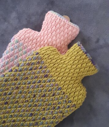 A combination of clusters and front-post stitches create this charming hot water bottle cover. Instructions are included for a 2.5-litre hot water bottle and a 1.75-quart (2-litre) hot water bottle. A side zip can be included to provide easy insertion and removal of the hot water bottle, or alternatively, insert the (rolled-up) hot water bottle through the top opening.
